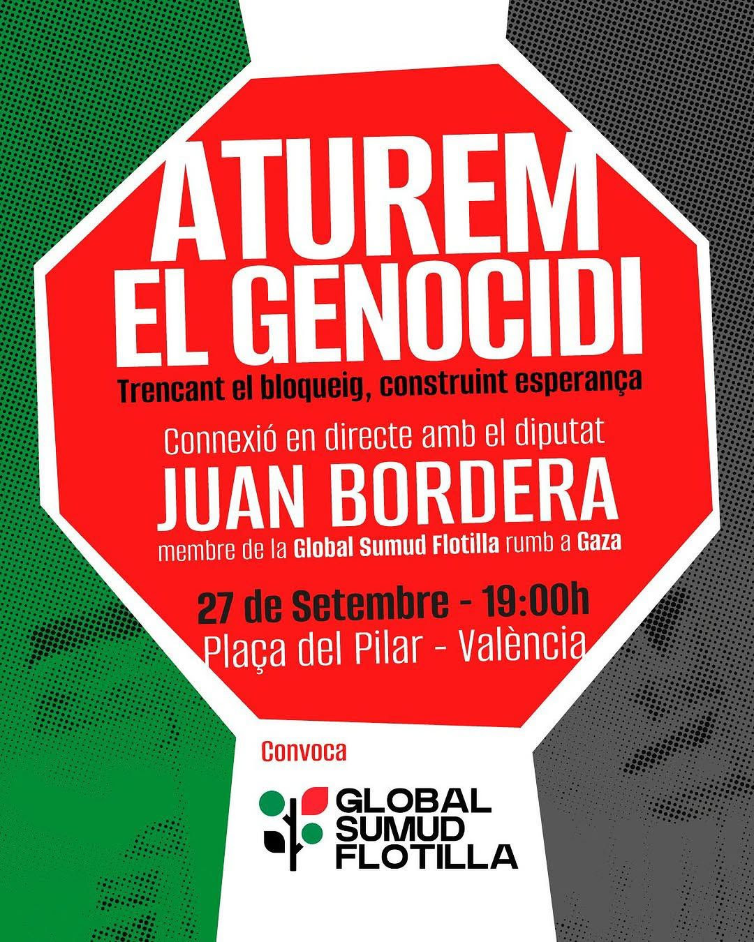 El grup de suport de la Global Sumud Flotilla organitza aquest 27 de setembre a les 19:00h a la Plaça del Pilar (València) un acte per a dir ben fort: ATUREM EL GENOCIDI. Cal trencar el bloqueig i construir esperança per al poble palestí.